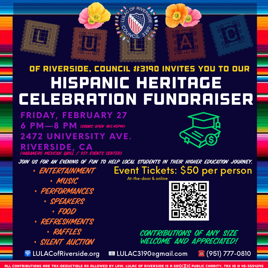 100% of the proceeds from this fundraiser go toward the LULAC of Riverside Scholarship Fund, a program of LULAC of Riverside, a registered 501(c)(3) public charity (Tax ID: 45-3554295). All contributions are tax-deductible as allowed by law.